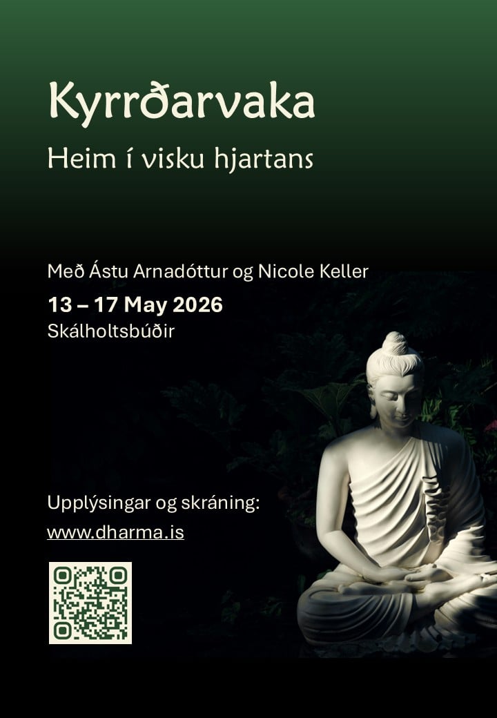 Í kyrrð og fegurð náttúrunnar dýpkum við iðkun núvitundar í nærandi samveru með sitjandi hugleiðslu, gönguhugleiðslu, meðvitaðri hreyfingu, tónheilun, yoga nidra og möntrusöng. Kyrrðarvakan er haldin í þögn með leiðsögn kennara, dharmahugleiðingar og leiddar hugleiðslur vökva fræ visku og kærleika. Einnig gefst tækifæri að hittast í smærri hópum í samtali sem styður við iðkunina.